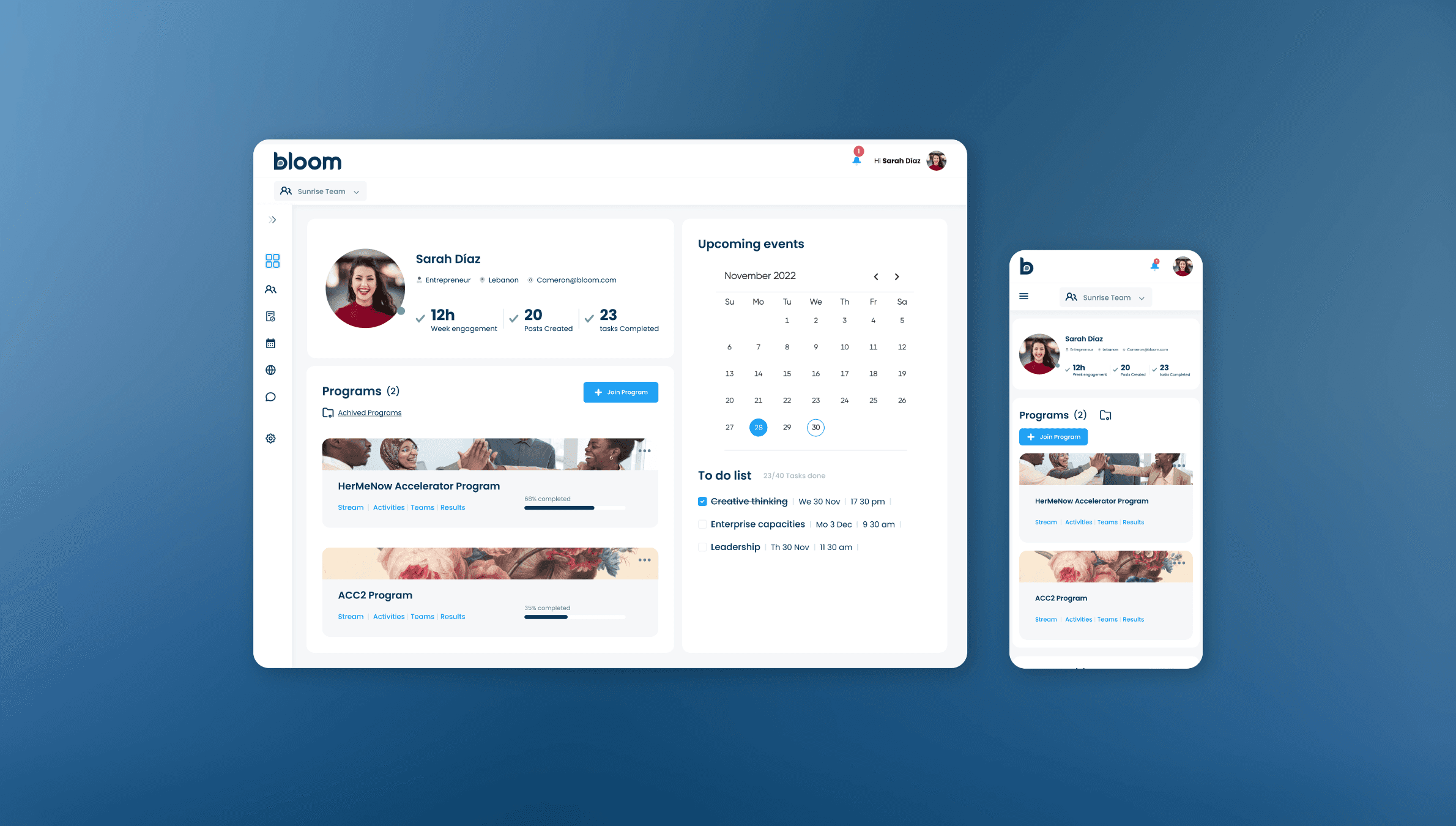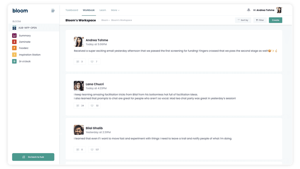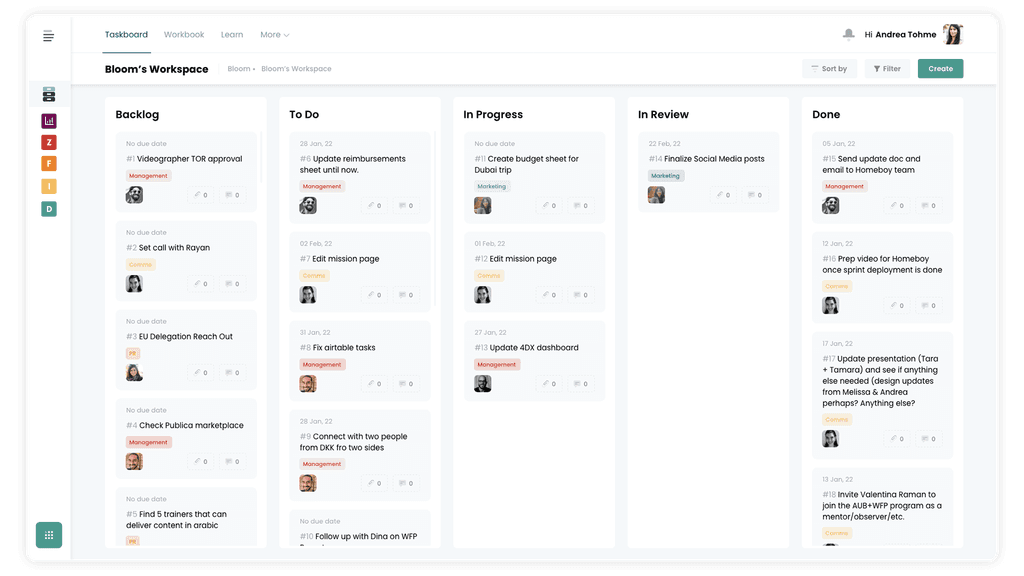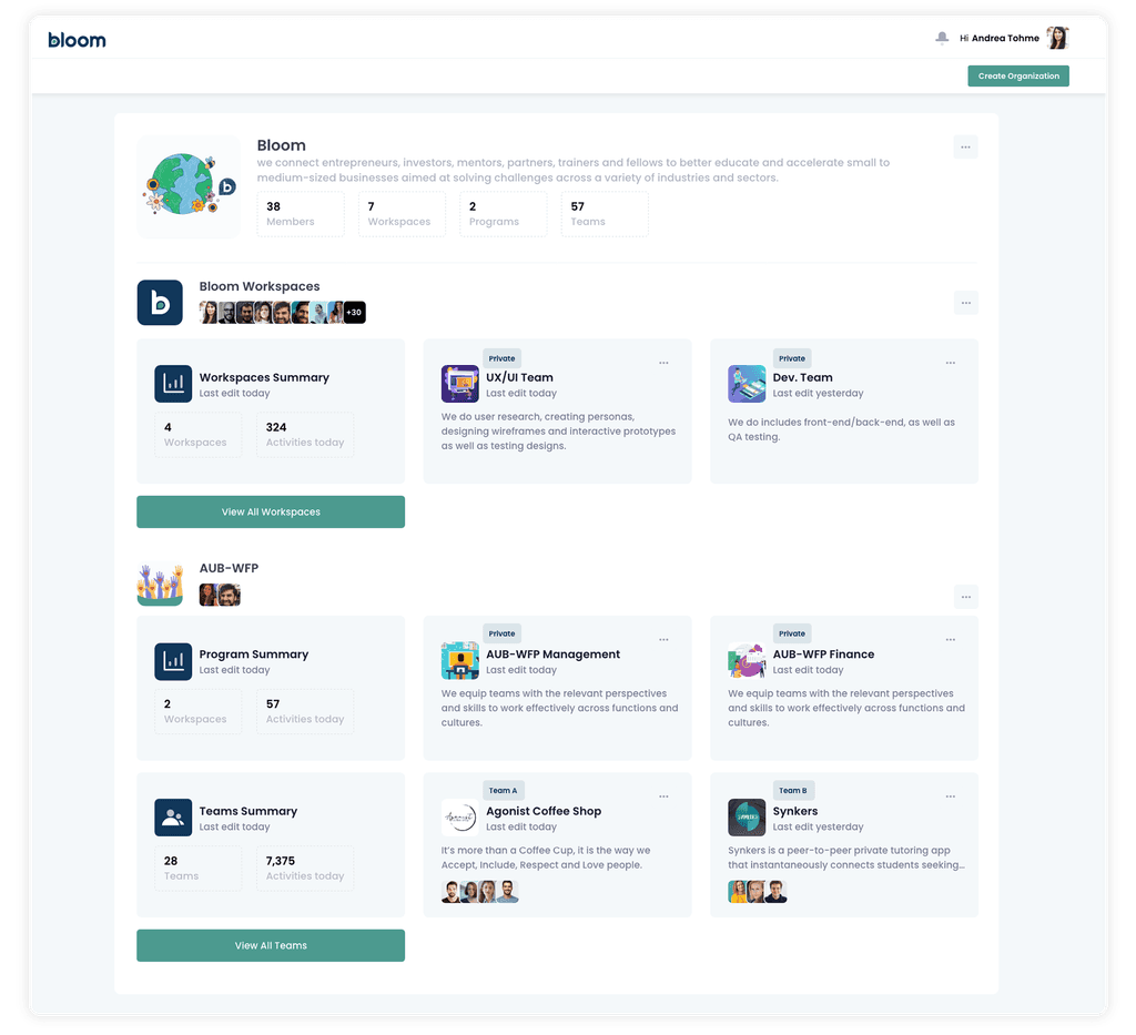 Understand the priorities, monitor, and support the people and teams in your programs with live dashboards and activity suggestions from our Bloom Library of Activities.